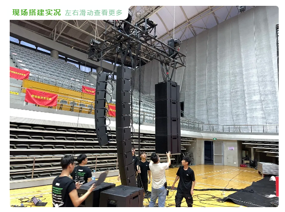音響團隊制作了T型桁架便于更準確的固定線陣列的吊掛位置。在體育館上方,共吊掛了6組音箱,單側吊掛3組,一組由12只EVU-2062/95組成,覆蓋正前方的領導區域與看臺區域;另一組又8只EVU-2062/95組成,朝向外側45度,用于覆蓋側面的看臺觀眾區;最后一組為4只EVU-2062/95,吊掛在全頻音箱后方,提供系統低頻能量的補充。