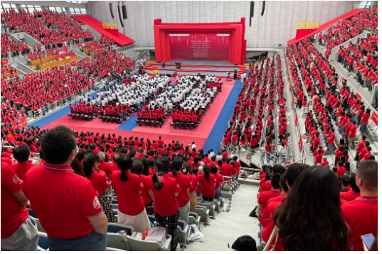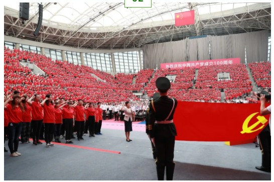 活動當天,主持人宣布慶祝大會正式開始,全體起立,高唱國歌,重溫入黨誓詞,現場氣氛激昂、人心振奮。