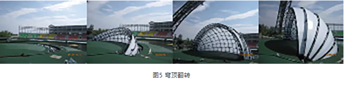 室外表演或?qū)嵕把莩鐾枰蟮奈枧_(tái)設(shè)備,提供與演出環(huán)境相適應(yīng)的大型表演舞臺(tái),并根據(jù)演出內(nèi)容進(jìn)行實(shí)時(shí)轉(zhuǎn)換。常規(guī)的平移、升降已無(wú)法滿足需求,需要平移、旋轉(zhuǎn)、傾斜、升降等運(yùn)動(dòng)形式的組合,實(shí)現(xiàn)大型舞臺(tái)場(chǎng)景的變化。如云南“希夷之大理”的旋轉(zhuǎn)升降組合穹頂翻轉(zhuǎn)技術(shù)的應(yīng)用。其主舞臺(tái)由旋轉(zhuǎn)相切的圓形組成,天棚穹頂是舞臺(tái)整體眼睛創(chuàng)意的眼珠,翻轉(zhuǎn)升起后可以作為投影幕使用。其中,五瓣穹頂既要相互分離,還要互相支持依靠,保證輕薄球面結(jié)構(gòu)的整體穩(wěn)定和變形控制,采用主次骨架結(jié)構(gòu)、同軸旋轉(zhuǎn)、液壓頂推、滾動(dòng)支撐、分離掛鉤等方法,實(shí)現(xiàn)穹頂翻轉(zhuǎn),如圖5所示。采用同心軌道、多點(diǎn)浮動(dòng)鏈輪驅(qū)動(dòng)、虛擬圓心定位、電纜滑車供電、液壓系統(tǒng)隨動(dòng)等方式,實(shí)現(xiàn)大型圓弧轉(zhuǎn)臺(tái)的360°旋轉(zhuǎn);采用自主液壓同步控制軟件,有效解決了不同液壓驅(qū)動(dòng)設(shè)備的同步問(wèn)題,穩(wěn)態(tài)同步控制精度小于5 mm。