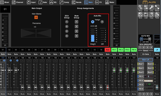 這里的AUTO MIX可分為兩組,分別為X和Y,還有一個(gè)AUTO Weight(自動(dòng)優(yōu)先級的量)可進(jìn)行調(diào)整,還有一個(gè)GR電平表可觀察到每個(gè)通道分享增益量的大小。