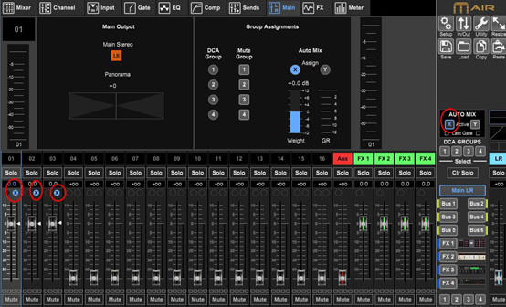 下面我給前三個(gè)通道編到X組,這里要注意的是,在給每個(gè)通道分完組之后,要記得把總的AUTO MIX的開關(guān)打開,如圖紅圈所示。