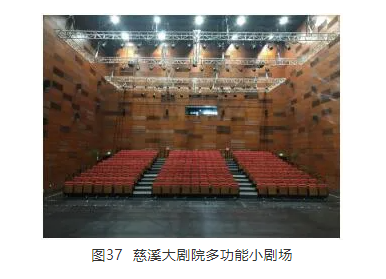 慈溪大劇院多功能小劇場由浙江大學聲學研究所負責建筑聲學設計,場地頂面采用全開放形式,排布了用于吊掛各種揚聲器、燈光設備的桁架,墻面采用面塊板作縱橫經緯的分割,內襯吸聲棉,建聲條件較好,廳堂固有中頻(500 Hz)混響時間的最終測量結果為1 s。此項目的電子聲學環境可變系統也選用了E-Coustic系統,因為整個空間為全開放式,所以,舞臺和觀眾席做了一體的聲學優化設計。整套系統總共使用了4支傳聲器和54只揚聲器,傳聲器選型與上述威海群藝館海洋劇場案例相同,分別吊裝于舞臺前方和中部的上空,以拾取舞臺任意位置的聲源。舞臺電子反聲罩系統共使用了23只揚聲器,觀眾席則共安裝了31只揚聲器,其中包括天花吊掛的6只超低揚聲器,所有揚聲器均采用明裝方式,如圖37所示。