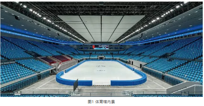 2022年北京冬奧會的主要比賽用館首都體育館,其建筑面積45 406 ㎡,其中,地下一層為38 842 ㎡,地上四、六層6 564 ㎡,建筑高度28.16 m。一層的中心場地內設有31 m×61 m具有多功能轉換的標準冰場,大頂鋁板造型至冰場的高度為20.6 m,觀眾席區設有15 400個座位,如圖1所示。
