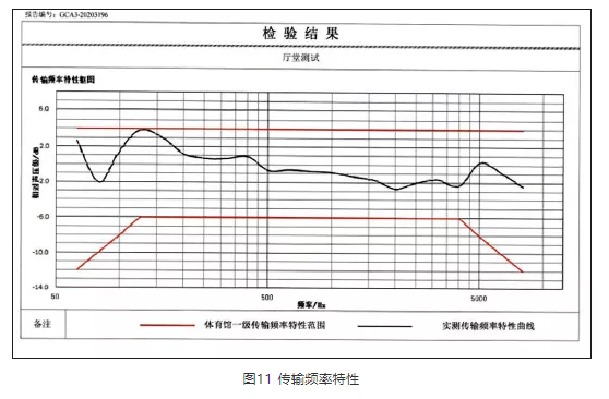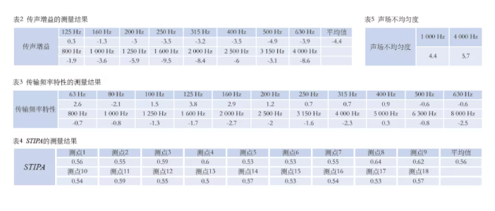 施工完畢后,進行了現場實測,測點如圖10所示。經現場測試,擴聲系統聲壓級可基本達到設計值,其他測量結果見圖11、表2—表4。測試結果反映,該項目達到設計目標及行業相關標準指標。