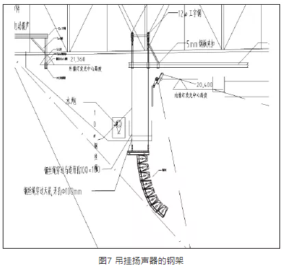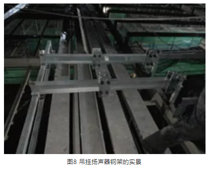 在揚聲器系統吊掛過程中,由于首都體育館保留了原有大頂球型網架結構、馬道,在球型網架的結構下還有鋁板造型結構以及龍骨,而揚聲器系統的吊掛點位于大廳頂層鋁板之上,需要穿過結構下懸桿、鋁板和鋁板固定龍骨層,避開燈光線路以及馬道,并且每一組線陣列揚聲器的安裝位置不相同,需要精確的定位,以滿足現場覆蓋的范圍及角度。基于這種情況,在進行了實地勘察測量后,經各方討論,最后選擇了單獨設計安裝鋼結構吊點的吊掛方式。根據現場不同的位置,定制吊掛揚聲器的鋼架,如圖7、圖8、圖9所示,吊掛高度可以在鋼架上調整。這一結構不僅可以避開場地照明光路等,還可以應對施工過程中馬道等一些設施的更改。