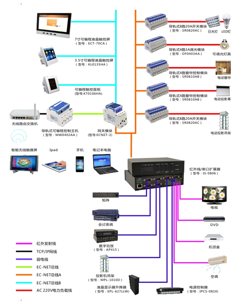 由若干個EC-NET總線A電箱,總控室EC-NET總線B,及主機、網(wǎng)關的系統(tǒng)模塊構成。