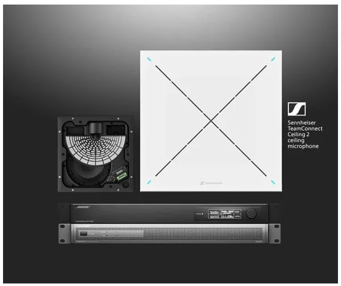 而針對全面集成的會議室,Bose ES1吸頂音頻解決方案則能夠提供完整的遠程會議音頻系統,結合Bose EdgeMax吸頂揚聲器和合作伙伴Sennheiser的TeamConnect Ceiling 2天花式吊頂陣列麥克風(TCC2)、Bose功放和DSP的卓越性能,打造無縫的會議體驗。同時ControlSpace EX遠程會議音頻處理器提供可擴展的平臺,使得會議系統更加穩定可靠。