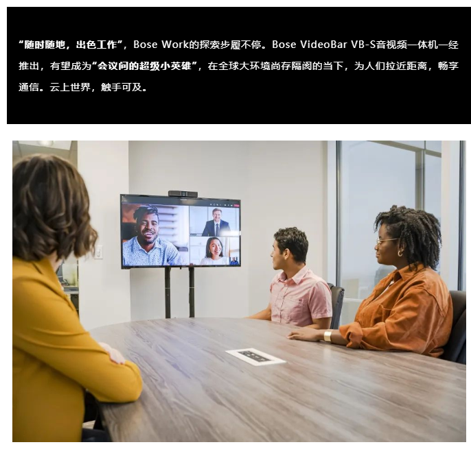 無論身處世界何地,體驗始終如一”以此為愿景,Bose Work推出年度新品Bose VideoBar VB-S音視頻一體機,為疫情常態化下的全球會議場景提供全新選項。