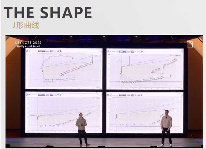 所有的這些形狀都有一個非常相似的趨勢——就是觀眾的距離越遠,音箱的吊掛高度越高。當我們安裝一個線陣列時,從數據上來看陣列都是呈相同的J型曲線頂部的陣列通常是小角度,越向底部角度逐漸增大,而這樣的漸進式構造已經應用了三十多年時間。