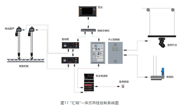 匯焰開發(fā)的一體式機械智能吊掛控制系統(tǒng)(見圖11),實現(xiàn)了傳統(tǒng)PLC控制吊桿和數(shù)控葫蘆系統(tǒng)的統(tǒng)一控制。系統(tǒng)通過數(shù)控葫蘆吊掛桁架作為固定吊桿的補充,原有吊桿與桁架可通過該系統(tǒng)實現(xiàn)一體式控制。系統(tǒng)根據(jù)需要組合擴展或臨時變更,通過對數(shù)控葫蘆編程控制,可實現(xiàn)桁架各種高度和角度的升降、偏轉(zhuǎn)。該系統(tǒng)也具有實時監(jiān)測承重載荷、舞臺機械位置和運動狀態(tài)、遠程控制時間碼同步、可視化對話界面等功能。