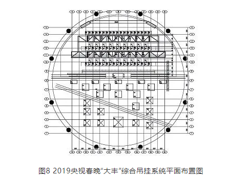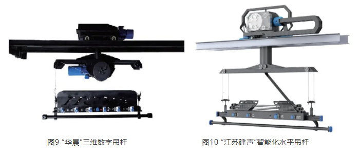大豐、華晨、江蘇建聲等企業(yè)的吊掛設(shè)備(見圖8~圖10),不僅滿足吊掛燈光設(shè)備的需求,還針對布景、道具和大屏幕等特殊設(shè)備做了專門設(shè)計。通過數(shù)控調(diào)速、變頻調(diào)速、雷達防碰撞、激光測距校準、運動速度反饋自控、運動參數(shù)預(yù)設(shè)記憶等技術(shù)手段,有效實現(xiàn)了多功能吊桿的升降、平移、旋轉(zhuǎn)等多維度動作的精準控制,并在運行精度、靜音和安全性等方面達到了動態(tài)參與演出的水平,在諸多重要演出中通過吊掛設(shè)備使燈具、道具和大屏幕等設(shè)備多維運動融入演出環(huán)節(jié),為節(jié)目增加了重要的表現(xiàn)手段。