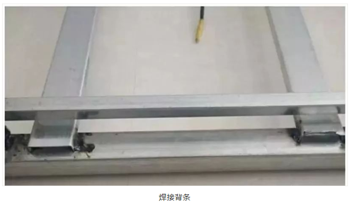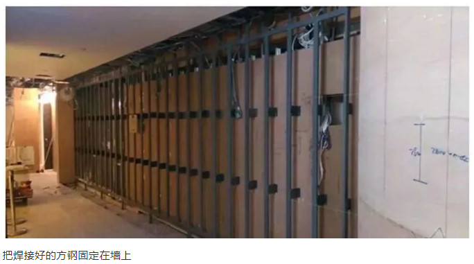 小連框做好后開始焊背條,前兩塊用板量著焊,找到尺寸后一直往下焊就行了。背條是40mm寬的,長度為1980mm左右,兩頭能夠著好焊就行。焊好后的邊框(照的是背面)邊框就可以拿到大廳內安裝了。墻頂部做好兩個角鋼掛鉤