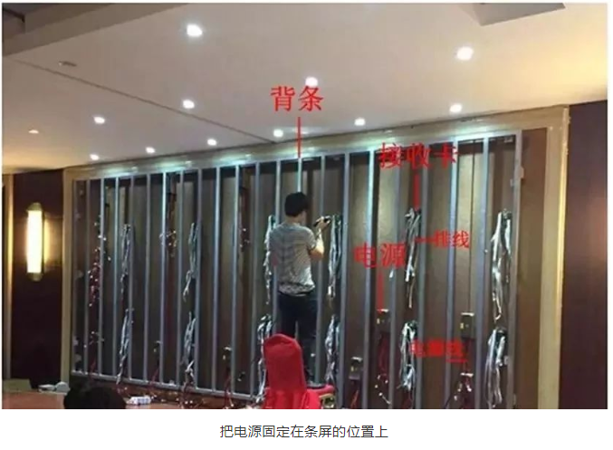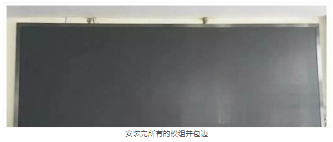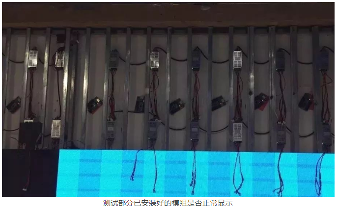 扣好不銹鋼邊后就能開紿上模組了。模組建議從下往上裝,從中間往兩邊開始安裝。這樣的安裝方式有很多爭議,從底部安裝主要是為了使水平和垂直都能在正常控制范圍內,特別是屏幕的面積大了以后,更加容易失控,特別是小間距的要求超高,有點縫隙沒有達到要求,都需要做精細的調整。