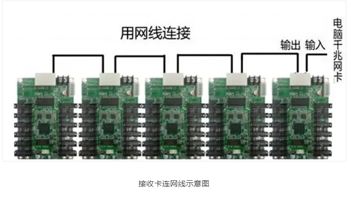 我們這里每張卡帶三列模組,共36塊板,這樣每三列裝一塊卡,從就近的電源上取5V給卡供上電,注意正負極,然后用網線把5張卡連起來,靠電源接頭的網口是輸入口,右邊是第1塊卡,也是頭卡,輸入接的是電腦的千兆網卡,然后輸出網口接的是第2塊卡的輸入口,第2塊卡的輸出口接的是第3塊卡的輸入口,這樣一直到最后一張卡,第5張卡,輸入接第4張卡的輸出。輸出口為空。