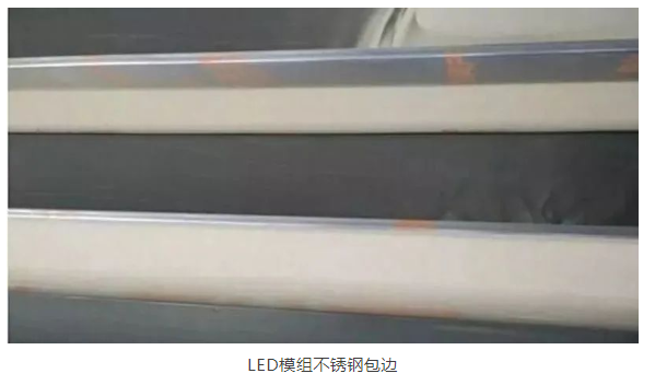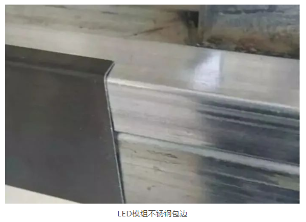 裝模組之前要用不銹鋼包邊,這僅僅是為了好看,也是安裝單位要求的,專門找來了做不銹鋼的師傅來量了尺寸,估算了下他量完鋼結構后加大了5mm吧,為方便能好安裝又能卡死不銹鋼包邊。這里因為屏幕尺寸不大,我們提前安裝的不銹鋼包邊,有時也可以在屏幕安裝完后再安裝不銹鋼包邊,但是要注意的就是底部第一排水平一定要做好。