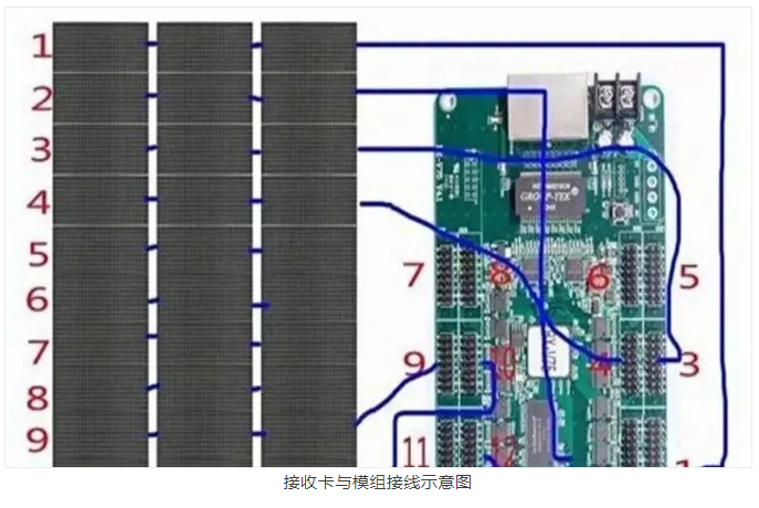 按照圖紙安裝模組自帶的排線,短排線只適合模組與模組的連接,從控制卡到模組的長排線是要安裝線序長短安裝的,最上面和最下面用的排線最長,我們這里大概是1米半長。