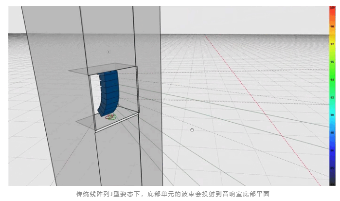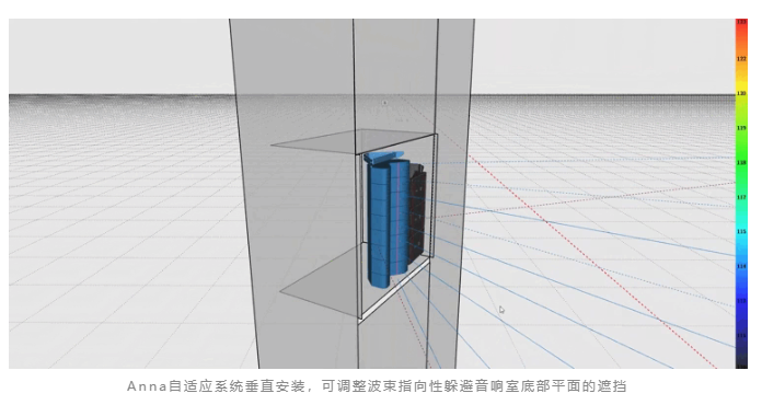 在暗裝的方式下音響室空間通常狹小緊湊。在本項(xiàng)目中,音響室的底部平面距離陣列僅10厘米。如果采用傳統(tǒng)線陣列的擴(kuò)聲系統(tǒng),陣列會(huì)形成J字型物理姿態(tài),不僅占用較大的安裝空間,J型底部的音箱單元還有可能將聲能投射到音響室的底部平面上,導(dǎo)致大部分高頻能量無法穿透出來,從而無法覆蓋到一部分前區(qū)的觀眾區(qū)。選用Anna,它的垂直吊裝方式既能節(jié)約了安裝空間,還能將高中低頻單元統(tǒng)一的盡可能靠近透聲幕,躲避音響室底部平面對波束的遮擋,最終實(shí)現(xiàn)幾乎全場的覆蓋。