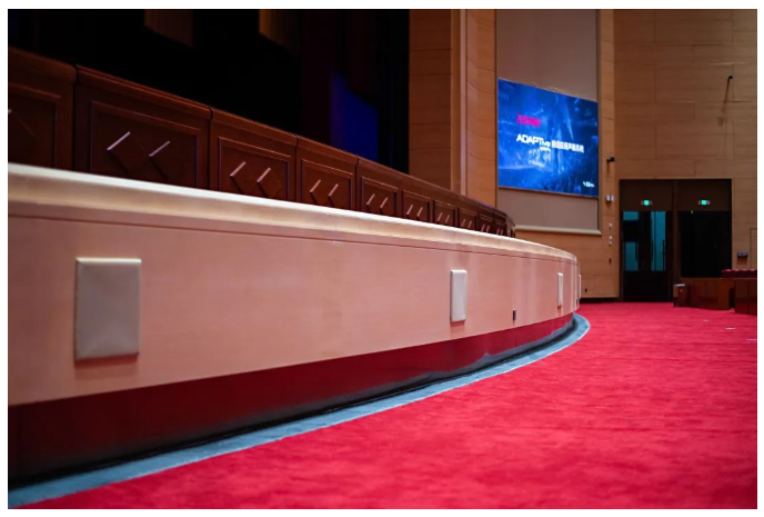 舞臺臺唇固定安裝了多只CMI5,為觀眾席前排座席補(bǔ)充中高頻響應(yīng)。CMI5是采用同軸設(shè)計(jì)的超緊湊兩分頻揚(yáng)聲器,可以提供優(yōu)秀的指向性控制和均勻一致的聽音體驗(yàn)。針對安裝位置過高,而造成的兩側(cè)主擴(kuò)揚(yáng)聲器覆蓋不足的情況,在左右八字墻大屏下方位置,固定暗藏了MKD896點(diǎn)聲源揚(yáng)聲器予以補(bǔ)充。