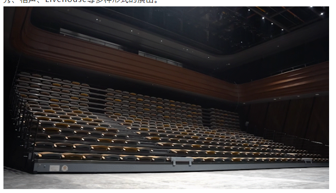 小劇場(chǎng)不設(shè)固定舞臺(tái)和觀眾席,使用時(shí)通過伸縮活動(dòng)座椅和拼裝式舞臺(tái)布置舞臺(tái)和觀眾席。活動(dòng)座椅看臺(tái)伸展時(shí)呈階梯狀,回收后靠墻層疊,美觀實(shí)用,又不占空間。