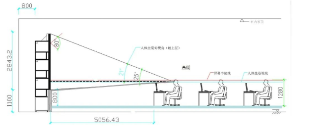 人眼的水平視線與投影屏幕垂直可獲得最佳的屏幕觀看效果,對于拼接大屏以最底一層屏幕的中位線作為基準。人體坐姿水平視線的高度一般為1.28米左右,讓拼接大屏最底一層屏幕的中位線距地面盡量接近這個高度為宜。