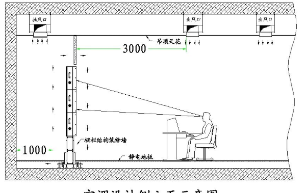 2)  整個大廳的燈按平行于屏幕方向分組進行控制,不要選用較強光的光源,燈光的布置原則是:使工作區有足夠燈光強度,但對屏幕又不會產生明顯的影響。