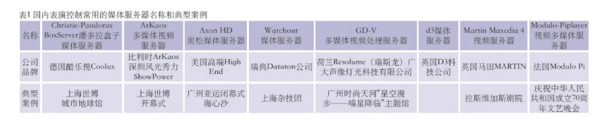 表1列出國內表演控制常用的媒體服務器名稱和典型案例。