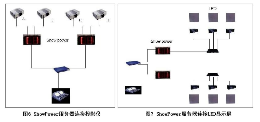 圖6和圖7分別示意了ShowPower服務器與投影儀與LED屏幕的連接。