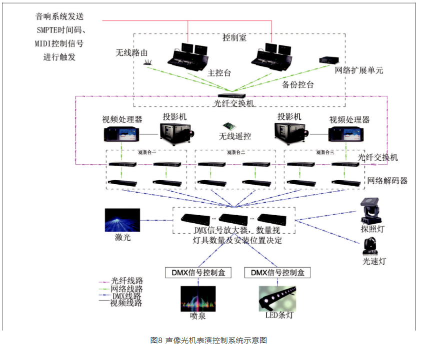 目前常用的聲像光機表演控制系統以燈光音視頻機械等各控臺為中心、時間碼為同步信號的方式,將燈光、音響、視頻和機械跟隨演出同步推進。本文主要分析采用運行DMX、MIDI、SMPTE等多種協議,控制常規燈具、電腦燈具、音響、投影、LED屏、噴泉、焰火、激光和機械(如冰屏或恐龍)動作等同步運行表演。該控制模式靈活可靠,有較廣泛的應用。