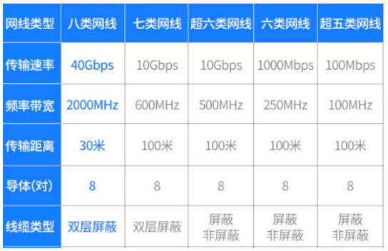 這里有必要提下八類網(wǎng)線,跟七類網(wǎng)線一樣的是雙層屏蔽(SFTP),它擁有兩個(gè)導(dǎo)線對(duì),2000MHz的超高寬屏,傳輸速率高達(dá)40Gb/s,但它最大傳輸距離僅有30m,故一般用于短距離數(shù)據(jù)中心的服務(wù)器、交換機(jī)、配線架以及其他設(shè)備的連接。雖然八類線傳輸距離短,但傳輸速率和頻率帶寬是遠(yuǎn)遠(yuǎn)超過其他類的。
