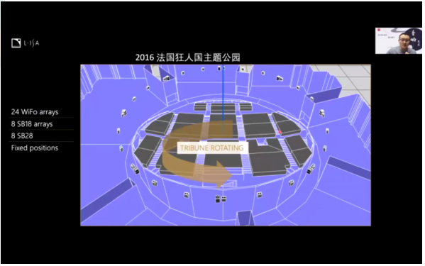 這個智能化的追蹤平臺叫做Black Trax,是一個基于視覺來追蹤的追蹤系統(tǒng),它可以在復(fù)雜的環(huán)境中實時的追蹤表演者,或任何帶有Black Trax信標(biāo)器的任何目標(biāo),還能發(fā)送定位信息到調(diào)光臺,媒體服務(wù)器或其他的第三方系統(tǒng),實現(xiàn)各個部門的聯(lián)通。2016年的法國狂人主題公園也運用到了這個技術(shù),整個舞美的布局十分巧妙,觀眾席中間圍繞著軸旋轉(zhuǎn),音響則是圍著周邊布置一圈,共有24組。在整個的場地和觀眾座位的旋轉(zhuǎn)以及演員行走的同時,聲音還是保持了定位。
