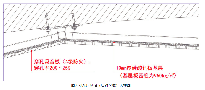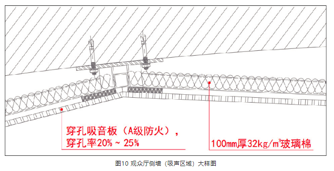 3) 側(cè)墻中段內(nèi)凹區(qū)域(圖4玫紅色墻面),2 m 以下人員活動(dòng)高度范圍內(nèi)(圖9),保留裝飾做法,做強(qiáng)吸聲處理,避免聲聚焦。穿孔吸音板穿孔率20%~25%,板后應(yīng)形成封閉空腔,空腔內(nèi)填100 mm厚32 kg/m3玻璃棉,見圖9、圖10。側(cè)墻吸聲區(qū)域與非吸聲區(qū)域裝飾效果保持統(tǒng)一。