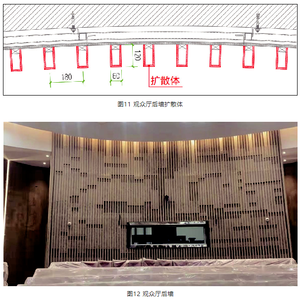 4) 裝飾在后墻(圖4磚紅色墻面)設(shè)置了豎向造型線條,將功能性與裝飾性相結(jié)合,能與墻面造型及飾面材料有機(jī)融合。室內(nèi)設(shè)計(jì)在側(cè)墻飾面材料拼縫間規(guī)律設(shè)置豎向LED燈帶,后墻豎向線條與側(cè)墻飾面材料風(fēng)格和諧統(tǒng)一。該豎向擴(kuò)散體寬度60 mm,突出高度120 mm,間距180 mm,擴(kuò)散體尺寸較小。見圖11、圖12。