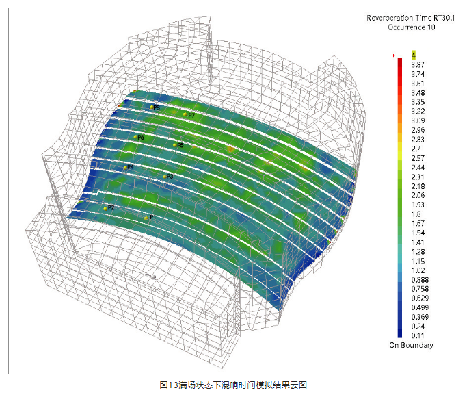 從圖13可以看出,盡管演奏廳內(nèi)少量位置存在混響時(shí)間偏長的情況,但整體來看,廳內(nèi)混響時(shí)間分布比較均勻。