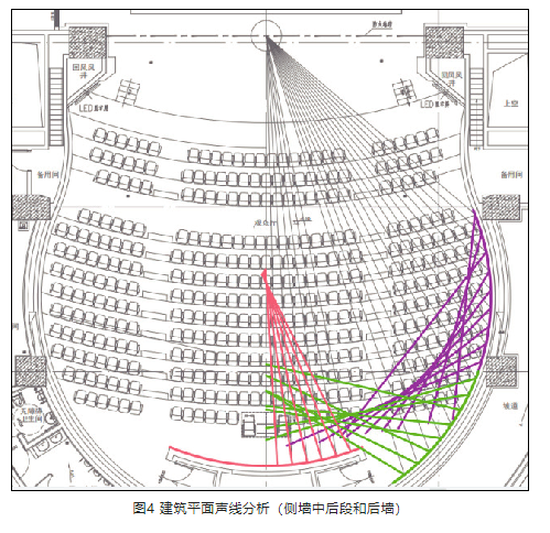 5) 側(cè)墻后段內(nèi)凹區(qū)域(圖4綠色色墻面)聲聚焦程度較弱,且聚焦點(diǎn)不在觀眾席。該區(qū)域如果做吸聲處理,會(huì)導(dǎo)致廳內(nèi)吸聲過量;如果做擴(kuò)散處理,與側(cè)墻其他區(qū)域裝飾風(fēng)格不統(tǒng)一,略顯突兀。因此,側(cè)墻后部內(nèi)凹區(qū)域未做處理。