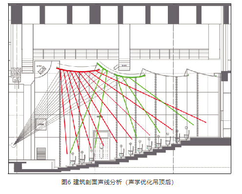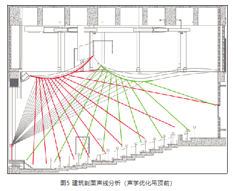 建筑剖面聲線分析(聲學(xué)優(yōu)化吊頂前)見圖5,建筑剖面聲線分析(聲學(xué)優(yōu)化吊頂后)見圖6。