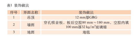 墻面采用穿孔板吸音板,地面鋪地毯,墻面和地面滿鋪吸聲材料,不符合“應(yīng)不用或少用吸聲材料”的聲學(xué)要求。裝飾吊頂采用12 mm厚GRG,面密度達(dá)不到聲學(xué)要求的40 kg/m2,會(huì)導(dǎo)致低頻吸聲過量。